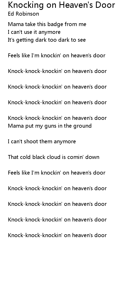Knocking On Heaven's Door - Bob Dylan - Lyrics/แปลไทย, For educational purposes only. Do not use commercial. Artist: Bob Dylan Album: Pat Garrett & Billy the Kid Released: 1973 * This . We Have got 11 images about Knocking On Heavens Door Lyrics images, photos, pictures, backgrounds, and more. In such page, we additionally have number of images out there. Such as png, jpg, animated gifs, pic art, symbol, blackandwhite, pics, etc. "Knocking On Heavens Door - RAIGN {LYRICS}", Hi there! I just came across this song in the TV-Show "The 100" and I fell in love with it, so I decided to make a lyrics video! :) Enjoy . "Bob Dylan Knockin\u2019 on heaven\u2019s door Traducci\u00f3n SUBTITULADO ESPA\u00d1OL - INGLES", Músico/banda...
